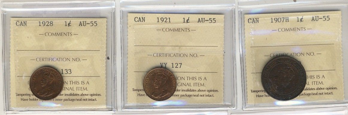 1907H 1¢, 1921 & 1928 ICCS AU55. Lot of 3 coins.