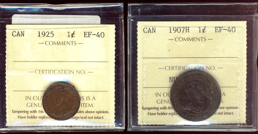 1907H 1¢ & 1925 ICCS EF40. Lot of 2 coins.