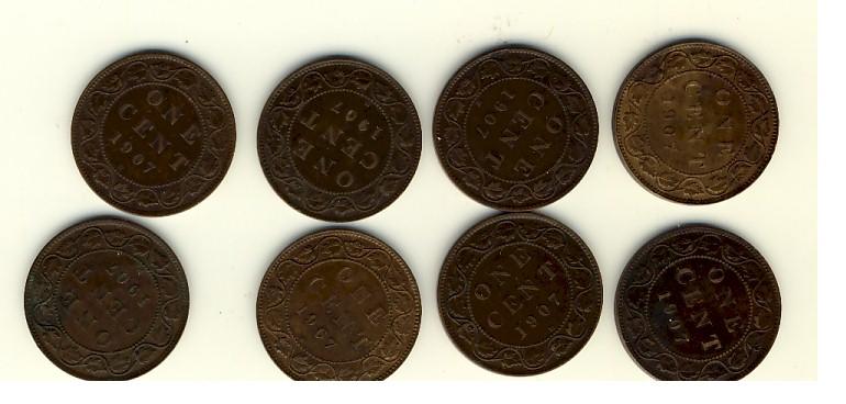 1907H 1¢. Lot of 8 coins all VF to EF or better.