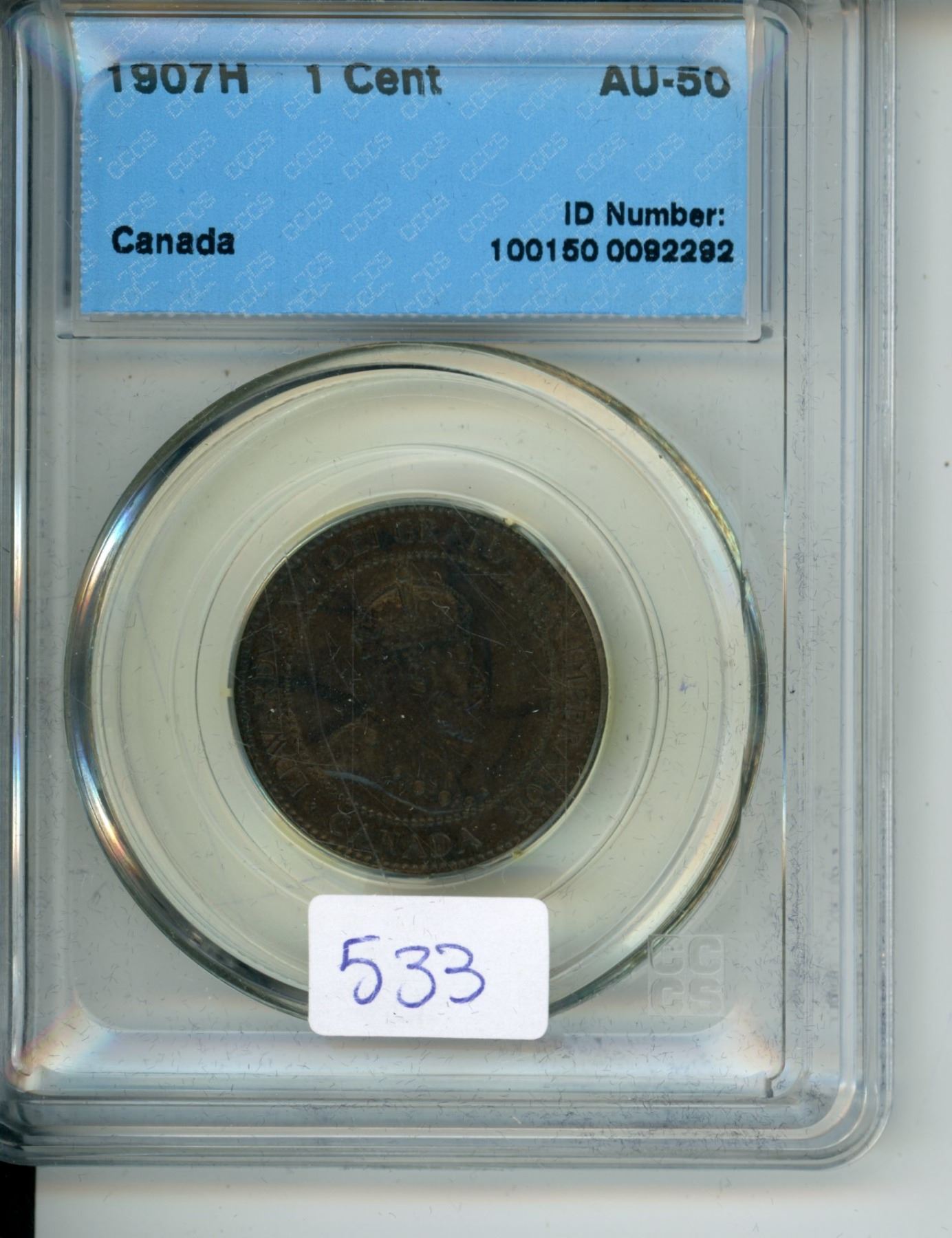 1907H Canadian CCCS Graded 1 Cent Coin - AU-50