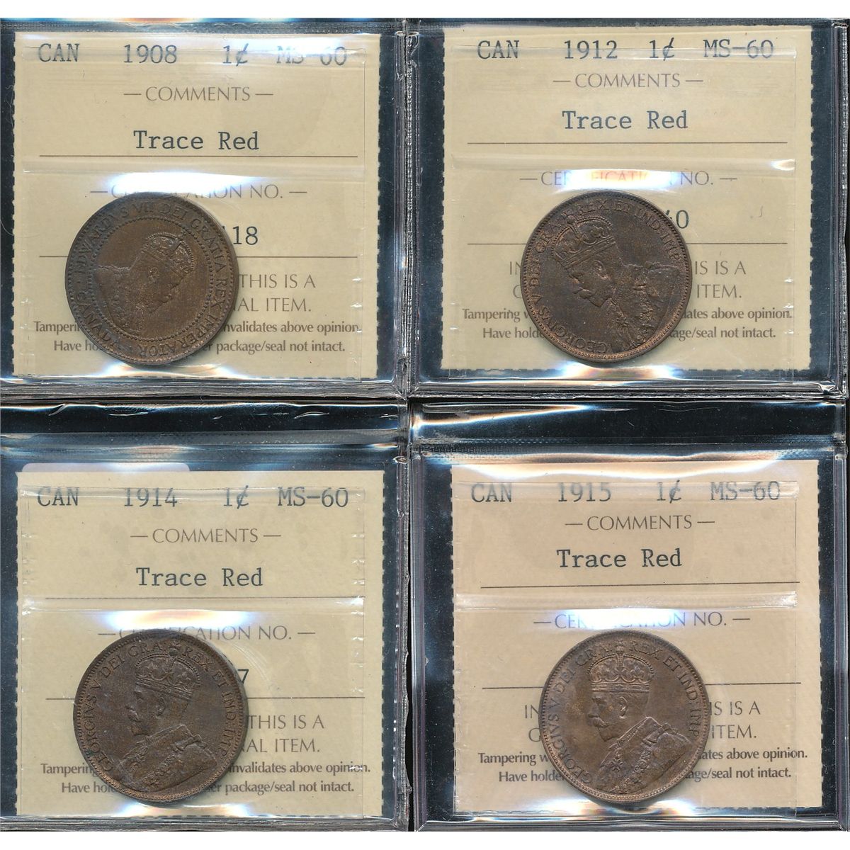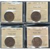 1908 1¢, 1912, 1914 & 1915 ICCS MS60 Trace Red. Lot of 4 coins.