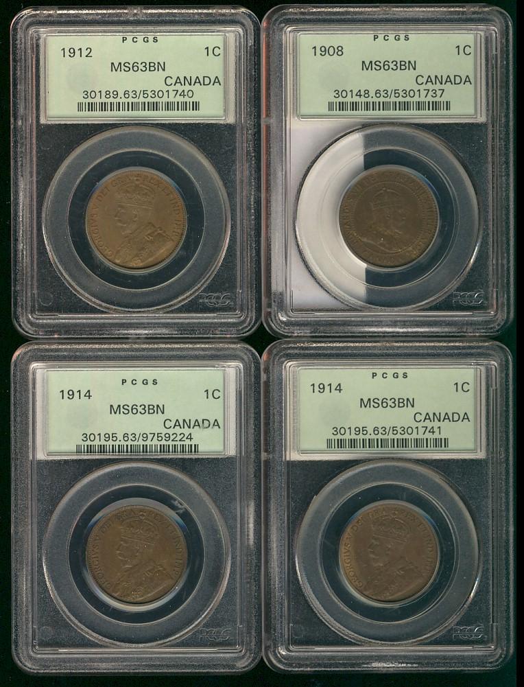 1908 1¢, 1912 & 1914(2) PCGS MS63BN. Lot of 4 coins.