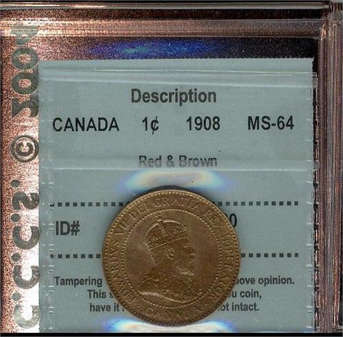 1908 1¢ CCCS MS64 red/brown. A nice example with clean surfaces. 20% lustre.