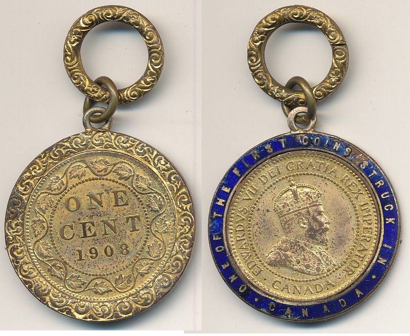 1908 1¢ encased enameled Brass issue. One of the first coins struck in Canada. Lettering or dark blue casing. AU for grade.