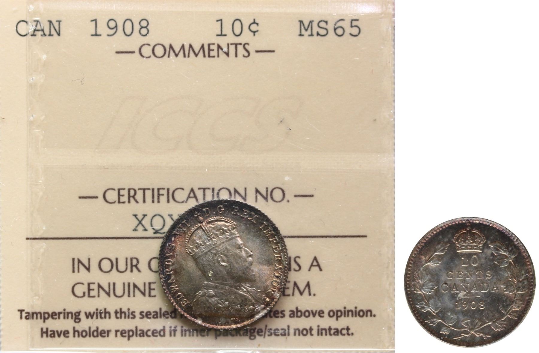 1908 10¢ ICCS Gem Mint State-65. Light autumn shades over full underlying lustre. A highly attractive and beautiful example.