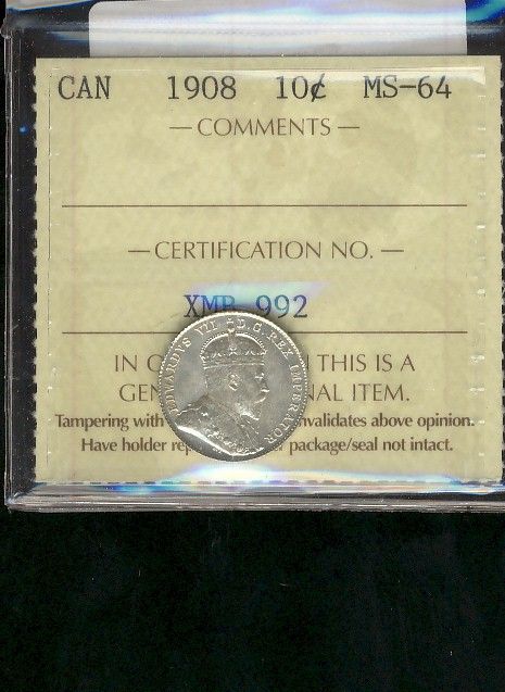 1908 10¢ ICCS MS64. Full white with lots of lustre.