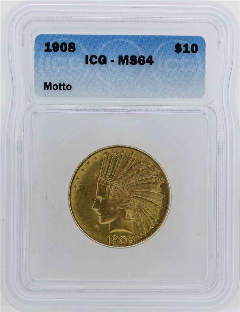 One 1908 $10 Indian Head Eagle Gold Coin ICG MS64. ICG Certified.