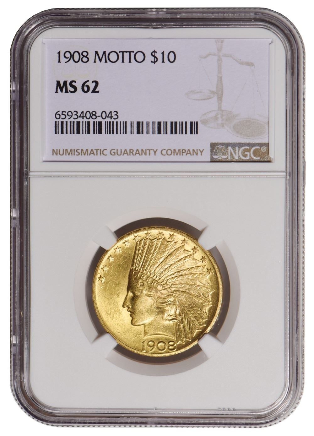 One 1908 $10 Indian Head Eagle Gold Coin NGC MS62.