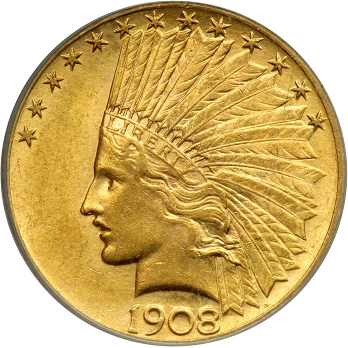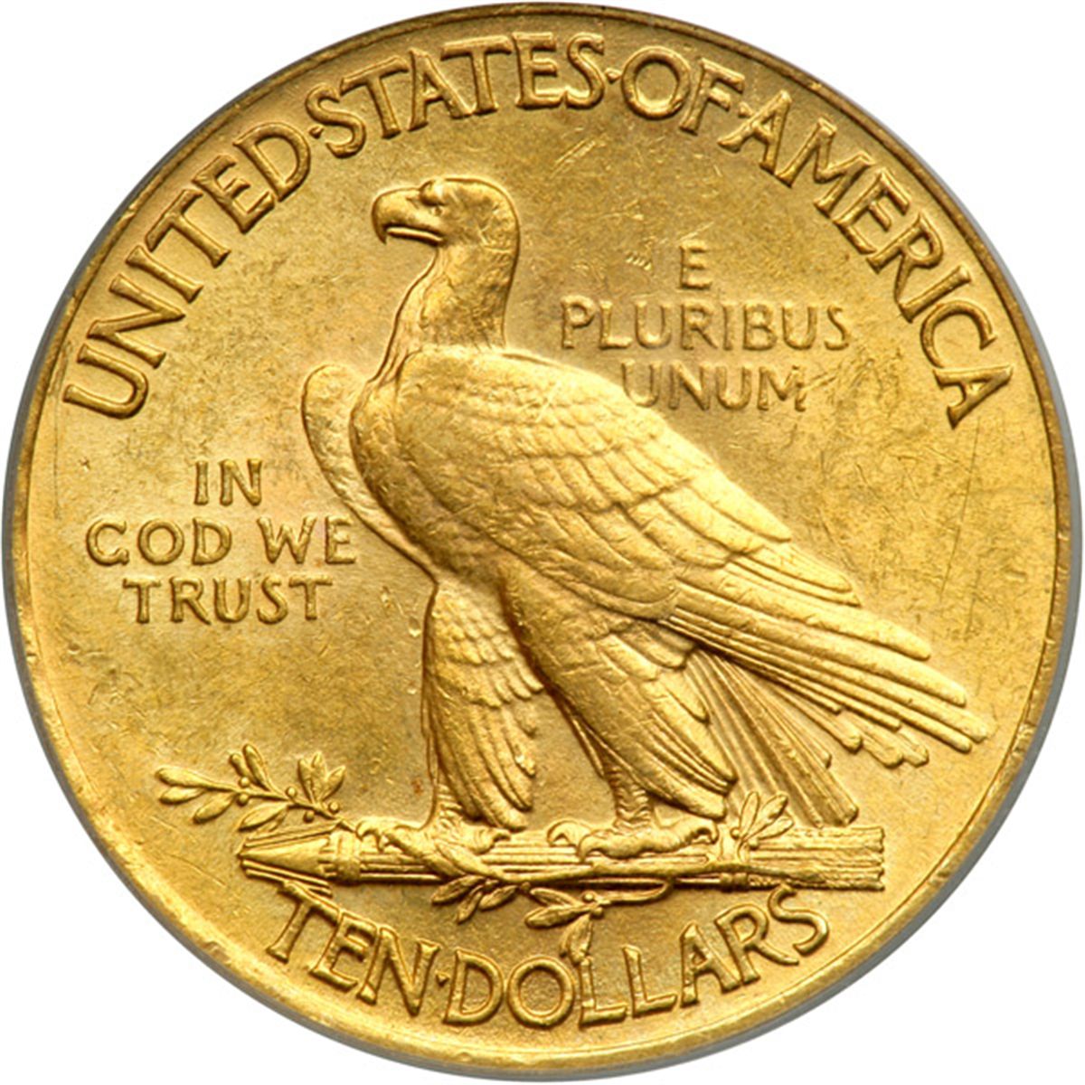 1908 $10 Indian. With motto. PCGS graded AU-58 PQ. Lovely golden toning (PCGS # 8859) .