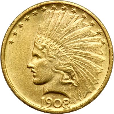 1908 $10 Indian. Our grade is Sharpness of MS60 Rim Nicks.