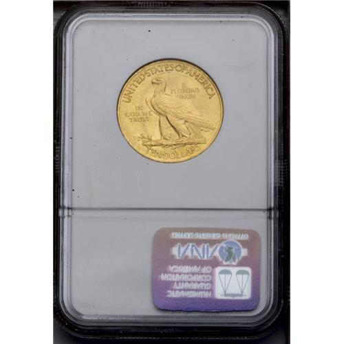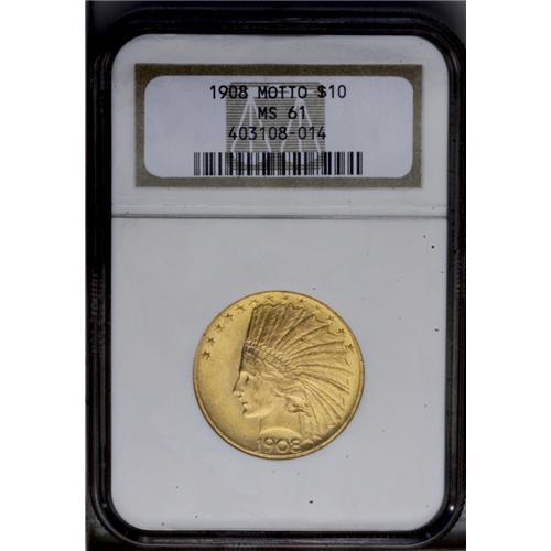 <B>1908<$10> Motto MS61 NGC.</B></I> Relatively unabraded for the assigned grade and boasting pleasing color and luster. Only a hint of flatness on the wingtip keeps this first-year issue from aspirations to a higher numeric rating.<BR><I>From The Steve Glenn Collection.</B></I> <BR><BR><B>Important notice:</B> Heritage usually auctions material at the rate of 200-250 lots per hour. On some occasions eBay Live bid software or the Internet may not be able to keep up with the pace of the auction. We recommend placing a realistic absentee bid now as insurance to avoid disappointment. Occasionally the auctioneer may eliminate or reject an eBay Live bid, and the auctioneer may also reopen a lot after the close of the eBay live bidding (usually because we missed an audience bid), and may reject your bid even if it shows you as the winning bidder. By bidding via eBay Live, you agree that Heritage may award the lot to another bidder at its sole discretion under the circumstances described above or any other reasonable circumstances. Since eBay bids are not shown to us until we open the lot on the floor, we treat those bids just like floor bids. In most cases the floor responds before the eBay bid is presented to us, due to Internet lag time, so for consistency we have made it a policy that floor bids are always considered first over tie eBay live bids. Also please note that all Heritage lots purchased through eBay Live carry a 20% Buyer's Premium. Please make sure you read the Terms and Conditions before you bid. This lot is being auctioned in conjunction with a live floor auction by Heritage Galleries & Auctioneers. All final auction and invoice information will be supplied by Heritage Galleries & Auctioneers, and all other information should be considered preliminary. Lot:4104 <BR><BR><B>Winning Notification and Billing:</B> After the FINAL session in this auction is complete, Heritage will send e-mail and snail mail invoices. This process normally takes several days. All final auction and invoice information will be supplied by Heritage Galleries & Auctioneers, and all other information should be considered preliminary. <BR><BR>This auction will be conducted on a live auction floor and over the Internet through eBay Live. If you choose to place an absentee bid, please take a moment to <font color='#0000ff'><u><a href='http://pages.ebay.com/liveauctions/help/before/laabsentee.html'>learn how eBay Live absentee bidding works</a></u></font><font color='#000000'>