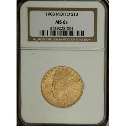 <B>1908 $10 Motto MS61 NGC.</B></I> NGC Census: (652/1311). PCGS Population (217/1374). Mintage: 341,300. Numismedia Wsl. Price for NGC/PCGS coin in MS61: $720. (#8859)<BR><BR><B>Coin Engraver:</B> Augustus Saint-Gaudens<BR><BR><b>Shipping:</b> Coins & Currency (<a target="_blank" href="http://www.heritageauctions.com/common/shipping.php">view shipping information</a>)