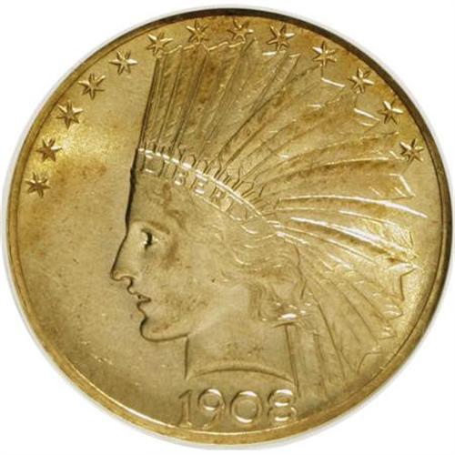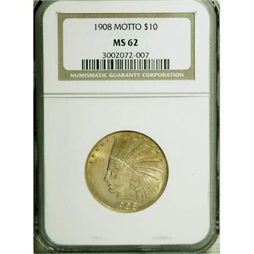 <B>1908 $10 Motto MS62 NGC.</B></I> NGC Census: (733/495). PCGS Population (673/605). Mintage: 341,300. Numismedia Wsl. Price for NGC/PCGS coin in MS62: $1,125. (#8859)<BR><BR><b>Shipping:</b> Coins & Currency (<a target="_blank" href="http://www.heritageauctions.com/common/shipping.php">view shipping information</a>)