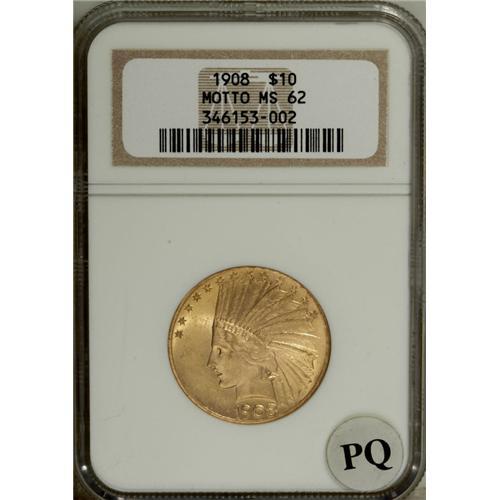 <B>1908 $10 Motto MS62 NGC.</B></I> Smooth, satiny yellow-gold surfaces characterize this sharply struck piece. A few minor distractions on each side are suitable for the grade.<BR><BR><b>Shipping:</b> Coins & Currency (<a target="_blank" href="http://www.heritageauctions.com/common/shipping.php">view shipping information</a>)