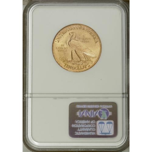 1908 $10 Motto MS62 NGC. Smooth, satiny yellow-gold su