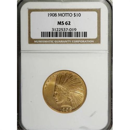 <B>1908 $10 Motto MS62 NGC.</B></I> A sharply struck and shining representative of this first-year Motto Saint-Gaudens eagle issue, far more appealing than the MS62 designation might suggest. Wispy abrasions in the yellow-gold and green-gold fields account for the grade.<BR><I>From The Parker Lee III Collection.</B></I><BR><BR><B>Coin Engraver:</B> Augustus Saint-Gaudens<BR><BR><b>Shipping:</b> Coins & Currency (<a target="_blank" href="http://www.heritageauctions.com/common/shipping.php">view shipping information</a>)