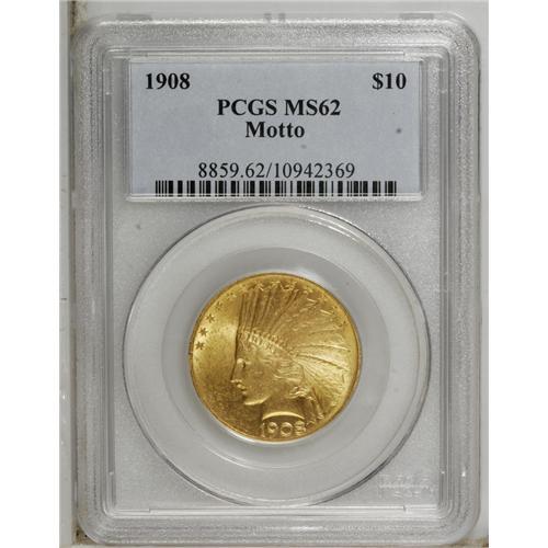<B>1908 $10 Motto MS62 PCGS.</B></I> A well struck butter-yellow example of the later Motto variety. The shimmering surfaces have a number of light abrasions, including several on the cheek.<BR><BR><b>Shipping:</b> Coin/Currency (<a target="_blank" href="http://www.heritageauctions.com/common/shipping.php">view shipping information</a>)