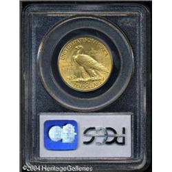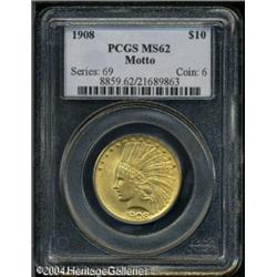 1908 $10 Motto MS62 PCGS. The surfaces assume a br <B>1908 $10 Motto MS62 PCGS.</B></I> The surfaces assume a bright, peach-gold color, and exhibit a few minor marks on the Indian's cheek and neck. The design features are relatively well struck, except for softness on the eagle's left shoulder. <BR><BR><B>Important notice:</B> Heritage usually auctions material at the rate of 200-250 lots per hour. On some occasions eBay Live bid software or the Internet may not be able to keep up with the pace of the auction. We recommend placing a realistic absentee bid now as insurance to avoid disappointment. Occasionally the auctioneer may eliminate or reject an eBay Live bid, and the auctioneer may also reopen a lot after the close of the eBay live bidding (usually because we missed an audience bid), and may reject your bid even if it shows you as the winning bidder. By bidding via eBay Live, you agree that Heritage may award the lot to another bidder at its sole discretion under the circumstances described above or any other reasonable circumstances. Since eBay bids are not shown to us until we open the lot on the floor, we treat those bids just like floor bids. In most cases the floor responds before the eBay bid is presented to us, due to Internet lag time, so for consistency we have made it a policy that floor bids are always considered first over tie eBay live bids. Also please note that all Heritage lots purchased through eBay Live carry a 20% Buyer's Premium. Please make sure you read the Terms and Conditions before you bid. This lot is being auctioned in conjunction with a live floor auction by Heritage Galleries & Auctioneers. All final auction and invoice information will be supplied by Heritage Galleries & Auctioneers, and all other information should be considered preliminary. Lot:6800