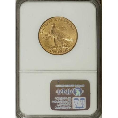 <B>1908 $10 Motto MS63 NGC.</B></I> The bright satiny surface reveal fine-grained surface textures and nice olive-gold coloration. A few shallow marks define the grade. The first year of the With Motto Indian Head eagle type. <BR><BR><b>Shipping:</b> Coins & Currency (<a target="_blank" href="http://www.heritageauctions.com/common/shipping.php">view shipping information</a>)