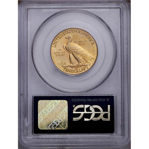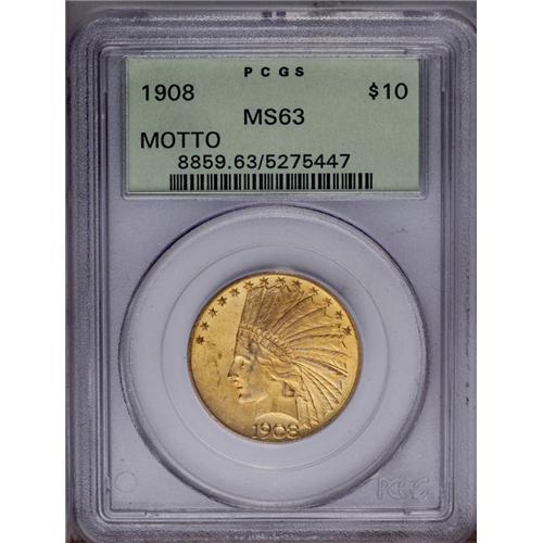 <B>1908<$10> Motto MS63 PCGS.</B></I> This original first-year Indian eagle has radiant orange and olive toning. A hint of gray accompanies the curl beneath the B in LIBERTY. Encased in a green label holder.