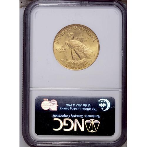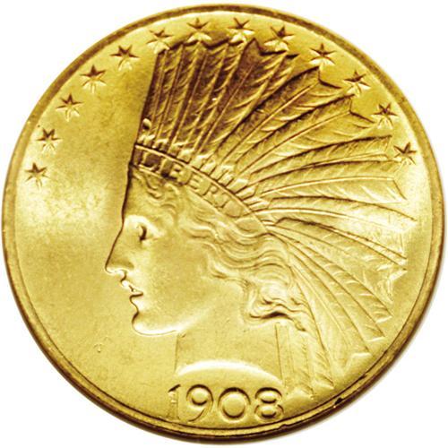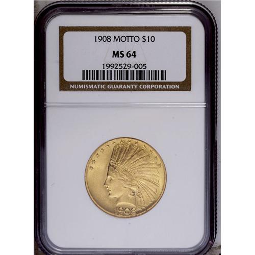 <B>1908<$10> Motto MS64 NGC.</B></I> Sharply struck with bright luster and minimally abraded surfaces. A lovely near-Gem example of this popular and well designed type coin. One of the more commonly encountered dates of the series, the 1908 With Motto is a coin that has always been popular with collectors, both because of its availability in AU and Uncirculated condition and because of its status as the first year of the With Motto type.