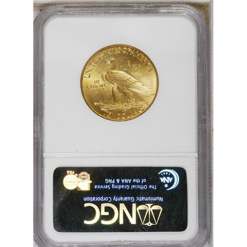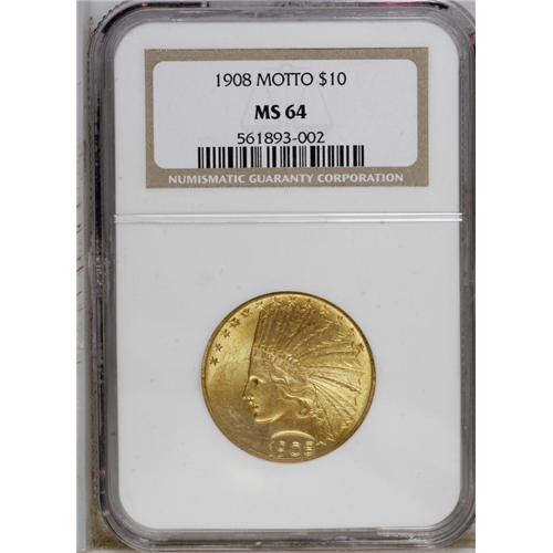 <B>1908<$10> Motto MS64 NGC.</B></I> While many more No Motto double eagles were coined than those of the Motto variety, for eagles, the reverse holds true. In spite of this, near-Gems are elusive. This example has highly lustrous honey-gold surfaces and a typical strike. The overall eye appeal is solid, though several thin abrasions appear to the left of the date.