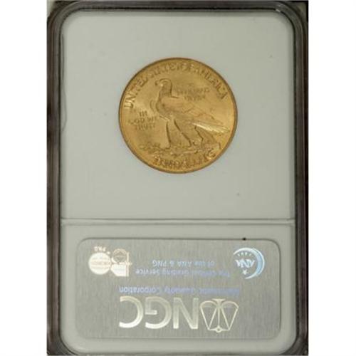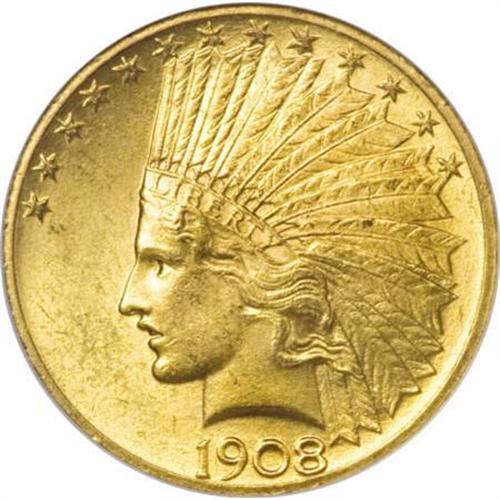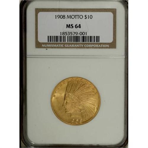 <B>1908 $10 Motto MS64 NGC.</B></I> Pleasing honey-gold coloration adorns the highly lustrous surfaces of this well struck near-Gem. A few wispy marks keep it from a Gem holder, but overall this piece seems high-end, for the grade. According to Garrett and Guth (2006): "Congress demanded that the motto IN GOD WE TRUST be restored to the eagles as it had been placed on all coinage soon after the Civil War. President Theodore Roosevelt (in office 1901 to 1909) felt that it was immoral to have God's name placed on a coin. Nevertheless, Congress prevailed and Charles Barber placed the motto before the eagle's breast." <BR><BR><B>Coin Engraver:</B> Augustus Saint-Gaudens<BR><BR><b>Shipping:</b> Coins & Currency (<a target="_blank" href="http://www.heritageauctions.com/common/shipping.php">view shipping information</a>)