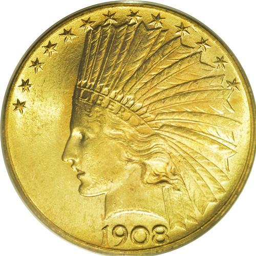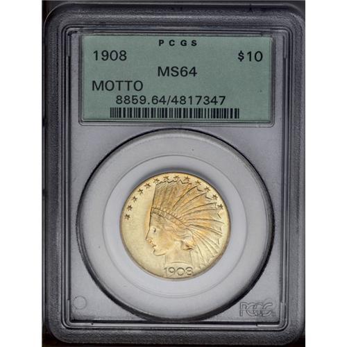 1908 $10 Motto MS64 PCGS. A lovely, shimmering example