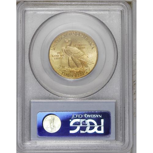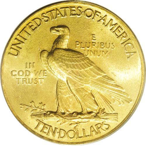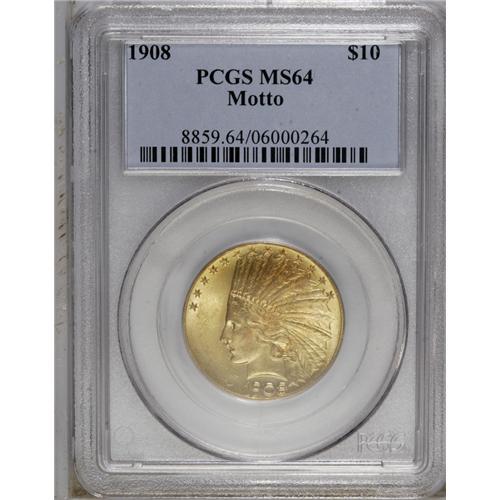 <B>1908<$10> Motto MS64 PCGS.</B></I> This is an attractive near-Gem that displays lovely, variegated mint-green and peach color and a bright, satiny finish. A few small abrasions are peppered over each, but they seem minimal for the grade. Always a popular coin because of its status as a first-year type and its relative availability in AU and Uncirculated grades.