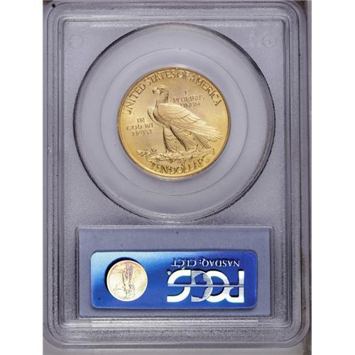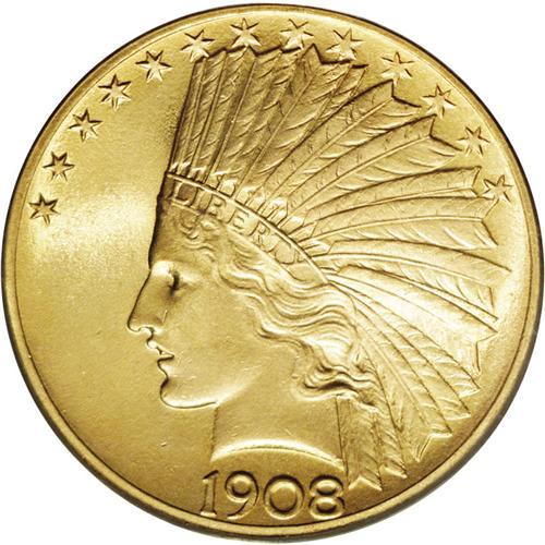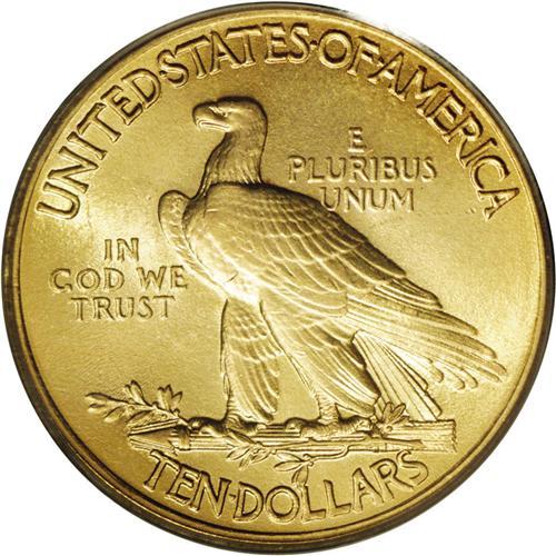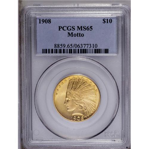 <B>1908<$10> Motto MS65 PCGS.</B></I> The 1908 ten dollar With Motto is fairly easy to locate in MS63 grades and below. The issue becomes more difficult to located in near-Gem, and MS65 examples, with a little more than 100 pieces certified, are scarce. The satiny surfaces of the coin presented in this lot display pleasing luster and attractive apricot-gold patina. The design elements are well impressed throughout. A few minute marks on the Indian's cheek and neck, and in the right (facing) reverse field, are mentioned for accuracy. Population: 55 in 65, 32 finer (2/06).