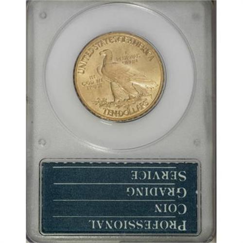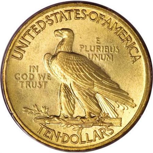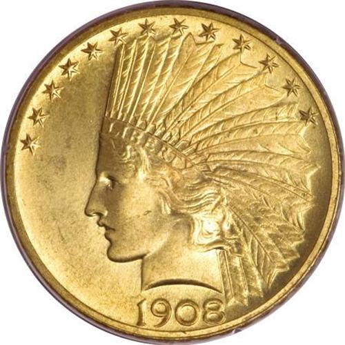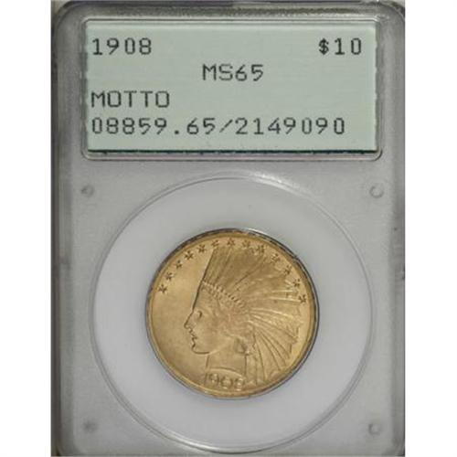 <B>1908 $10 Motto MS65 PCGS.</B></I> This is a splendid Gem example of the 1908 With Motto Indian Head eagle. The striking detail is exceptionally crisp, and brings up even the subtler elements of Saint-Gaudens' great design (which was modified somewhat by Chief Engraver Charles Barber, who also added the motto IN GOD WE TRUST to the left reverse field). A single small contact mark is noted on Liberty's face, just to the left of the ear. Housed in a small, first-generation PCGS holder. Population: 61 in 65, 36 finer (3/08).<BR><BR><B>Coin Engraver:</B> Augustus Saint-Gaudens<BR><BR><b>Shipping:</b> Coins & Currency (<a target="_blank" href="http://www.heritageauctions.com/common/shipping.php">view shipping information</a>)