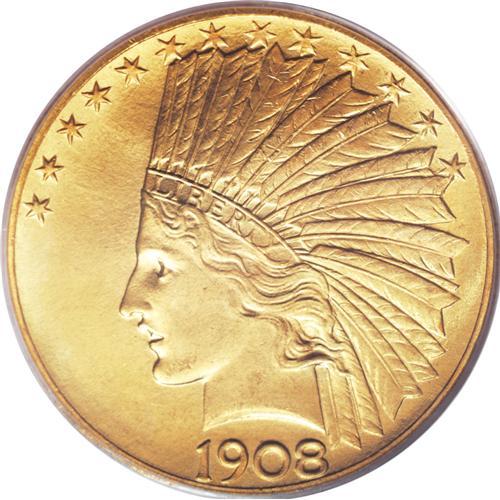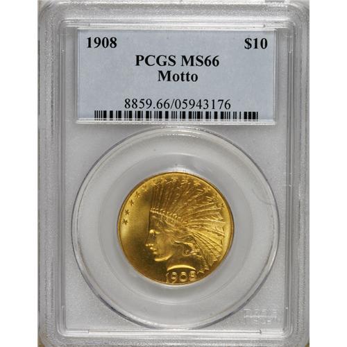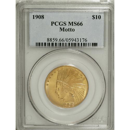 <B>1908 $10 Motto MS66 PCGS.</B></I> An impressive 341,370 business strike 1908 ten dollar coins were struck with the motto IN GOD WE TRUST on the reverse. Collectors seeking Uncirculated pieces should have little trouble locating a nice one, as PCGS and NGC have certified several hundred examples through MS64. Higher-grade Uncirculated coins, especially MS66 and finer, are considerably more difficult to acquire.<BR> Rich orange-gold patina with lime-green accents occupies both sides of the marvelous Premium Gem in this lot, as does outstanding luster, which is typical for the issue. Moreover, a sharp strike has emboldened the design features, including excellent definition in the Indian's hair and bonnet feathers, and the eagle's plumage. A couple of trivial reverse marks prevent an even finer grade. Population: 25 in 66, 7 finer (3/07).<BR><BR><b>Shipping:</b> Coins & Currency (<a target="_blank" href="http://www.heritageauctions.com/common/shipping.php">view shipping information</a>)