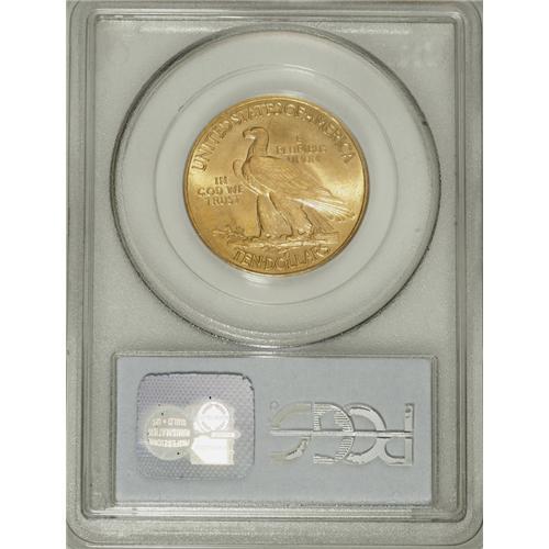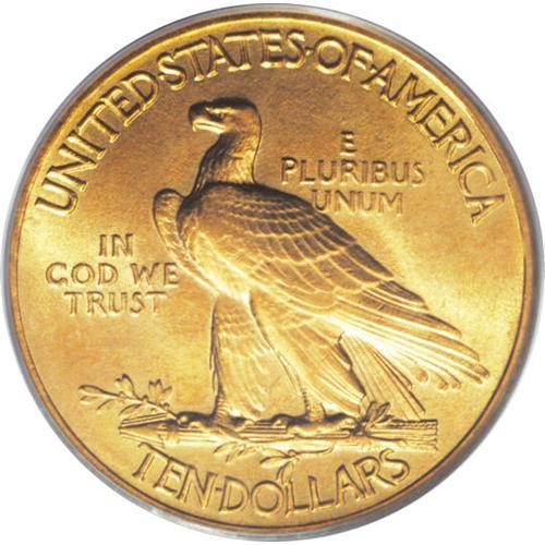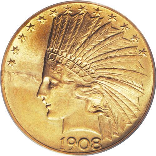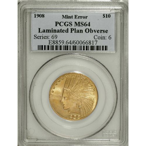 <B>1908 $10 Motto--Mint Error--Laminated Planchet--MS64 PCGS.</B></I> Gold errors are quite rare and elusive, and gold errors in such high grade are even more abstruse. This piece shows a prominent, elongated planchet lamination that runs from the obverse rim just above 9 o'clock through the Indian's eye, that was clearly present before striking. Elsewhere the surfaces show beautiful apricot-gold patina with bold luster, and a notable absence of impairments. An interesting coin for the gold error specialists.<BR><BR><b>Shipping:</b> Coins & Currency (<a target="_blank" href="http://www.heritageauctions.com/common/shipping.php">view shipping information</a>)