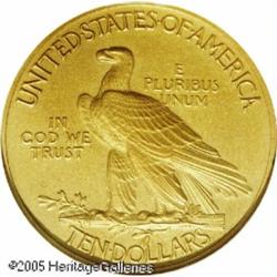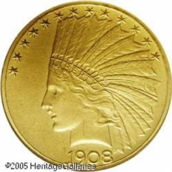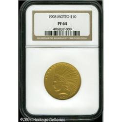 <B>1908 $10 Motto PR64 NGC.</B></I> Of the 116 proof Tens struck in this year, all but two have the distinctive dark finish this year is known for, somewhere between a khaki and olive color. While it is widely recognized that the 1908 is the most "common" date among matte proof Ten Indians, the number of survivors is not as large as one might at first believe. Traditional sources state that somewhere between two and three dozen pieces exist today. However, we believe a larger number are extant, somewhere in the range of 40-55 coins. This is a pleasing coin that exhibits the coarse-grain finish and the deeper color common to this year with a couple of shiny spots over the highpoints on each side that serve to limit the grade. Lot:8907