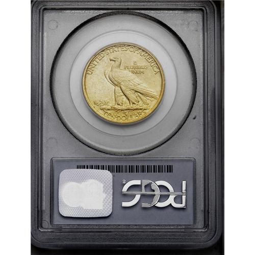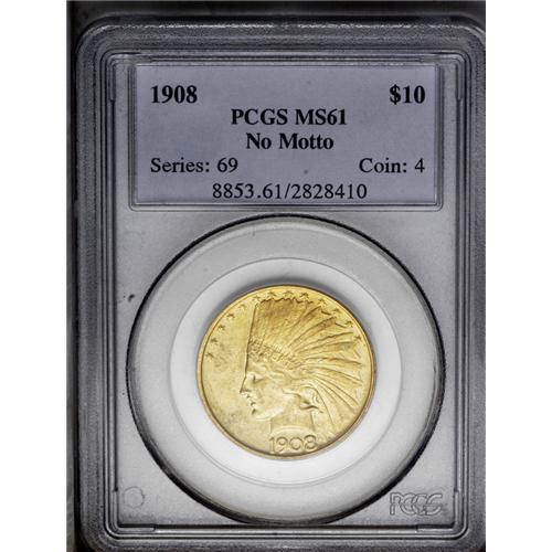 <B>1908<$10> No Motto MS61 PCGS.</B></I> This second-year example has full glowing luster and rich green-gold and peach toning. Typically softly struck on some of the headdress and hair details. A few minor marks are noted in the obverse and reverse fields. Considerably scarcer than the Motto variety of the same year.<BR><I>From The Steve Glenn Collection.</B></I> <BR><BR><B>Important notice:</B> Heritage usually auctions material at the rate of 200-250 lots per hour. On some occasions eBay Live bid software or the Internet may not be able to keep up with the pace of the auction. We recommend placing a realistic absentee bid now as insurance to avoid disappointment. Occasionally the auctioneer may eliminate or reject an eBay Live bid, and the auctioneer may also reopen a lot after the close of the eBay live bidding (usually because we missed an audience bid), and may reject your bid even if it shows you as the winning bidder. By bidding via eBay Live, you agree that Heritage may award the lot to another bidder at its sole discretion under the circumstances described above or any other reasonable circumstances. Since eBay bids are not shown to us until we open the lot on the floor, we treat those bids just like floor bids. In most cases the floor responds before the eBay bid is presented to us, due to Internet lag time, so for consistency we have made it a policy that floor bids are always considered first over tie eBay live bids. Also please note that all Heritage lots purchased through eBay Live carry a 20% Buyer's Premium. Please make sure you read the Terms and Conditions before you bid. This lot is being auctioned in conjunction with a live floor auction by Heritage Galleries & Auctioneers. All final auction and invoice information will be supplied by Heritage Galleries & Auctioneers, and all other information should be considered preliminary. Lot:4100 <BR><BR><B>Winning Notification and Billing:</B> After the FINAL session in this auction is complete, Heritage will send e-mail and snail mail invoices. This process normally takes several days. All final auction and invoice information will be supplied by Heritage Galleries & Auctioneers, and all other information should be considered preliminary. <BR><BR>This auction will be conducted on a live auction floor and over the Internet through eBay Live. If you choose to place an absentee bid, please take a moment to <font color='#0000ff'><u><a href='http://pages.ebay.com/liveauctions/help/before/laabsentee.html'>learn how eBay Live absentee bidding works</a></u></font><font color='#000000'>