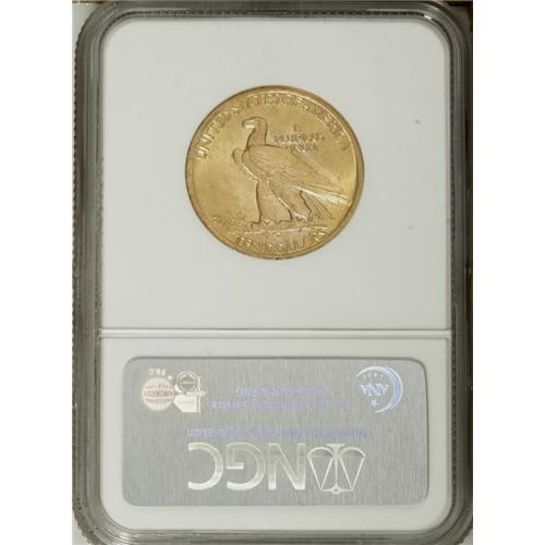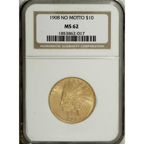 <B>1908 $10 No Motto MS62 NGC.</B></I> From an original mintage of just 33,500 pieces comes this pretty honey-gold example. The obverse fields are quite clean, while the reverse shows a few scattered marks in the field and along the rim at the 9 o'clock position. A lustrous piece which would make a nice addition to a type set.<BR><BR><b>Shipping:</b> Coin/Currency (<a target="_blank" href="http://www.heritageauctions.com/common/shipping.php">view shipping information</a>)