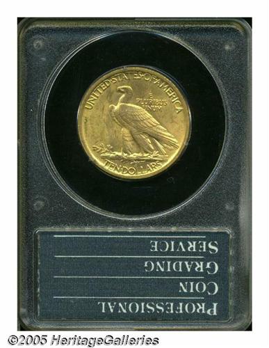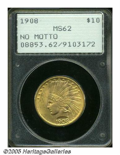 <B>1908<$10> No Motto MS62 PCGS.</B></I> This original and lustrous introductory year Indian Eagle has pastel lime and apricot color. Certified in a first generation, small-sized holder.