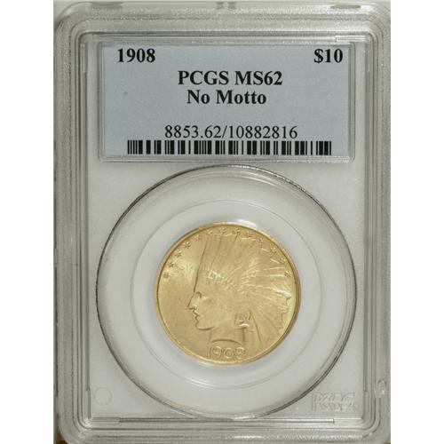 <B>1908 $10 No Motto MS62 PCGS.</B></I> Well struck with occasional copper spots near the periphery on each side. A few light abrasions are noted on the satiny mustard-gold surfaces.<BR><BR><b>Shipping:</b> Coin/Currency (<a target="_blank" href="http://www.heritageauctions.com/common/shipping.php">view shipping information</a>)