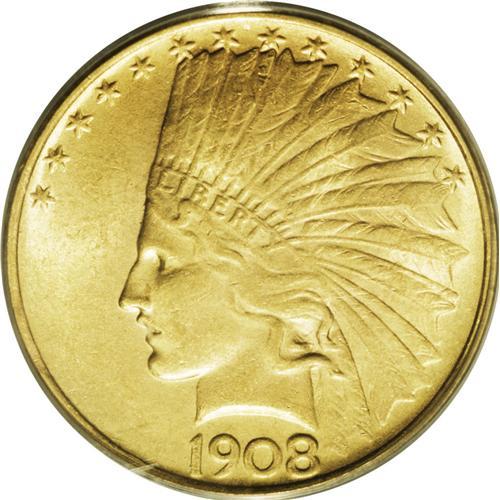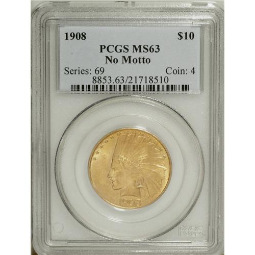 <B>1908 $10 No Motto MS63 PCGS.</B></I> In a reversal from the double eagle pattern, the majority of 1908 Saint-Gaudens eagles were of the With Motto variety, and only 33,500 No Motto examples were struck. Of those, this is a high-grade survivor. The lustrous amber-gold surfaces host devices that have soft centers, as often seen on this issue. The fields have few marks for the grade, which only enhances the considerable eye appeal.<BR><I>From The Dr. Eugene Cherny Collection of $5 and $10 Indians.</B></I><BR><BR><b>Shipping:</b> Coin/Currency (<a target="_blank" href="http://www.heritageauctions.com/common/shipping.php">view shipping information</a>) <BR><BR><B>Important notice