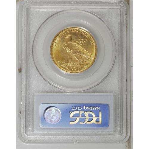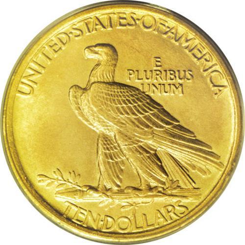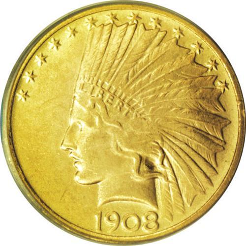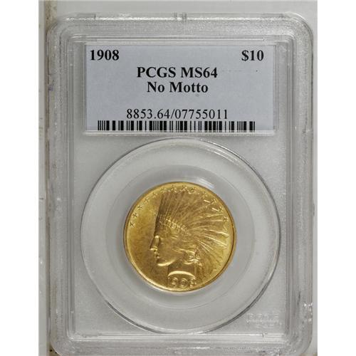 <B>1908<$10> No Motto MS64 PCGS.</B></I> A satiny near-Gem with sharp design elements, especially on the reverse, which has a fully detailed eagle. This issue ranks near the middle of the series for rarity in Mint State, but Choice pieces and above command a strong premium today. Bid accordingly. Population: 61 in 64, 26 finer (9/06).