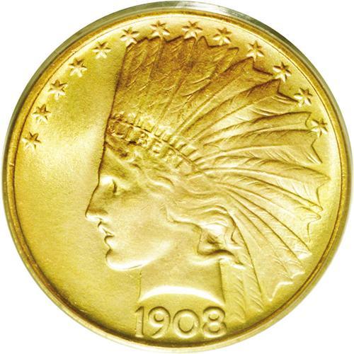 <B>1908<$10> No Motto MS66 PCGS.</B></I> Ex: Duckor/Kruthoffer Collection. The first ten dollar gold pieces struck at Philadelphia and Denver in early 1908 did not contain the motto IN GOD WE TRUST. This was because President Theodore Roosevelt personally objected to the use of the Deity's name on coins. He probably recalled the jeers and remarks that greeted the original addition of this motto to American coinage, such as "In God We Trust-All Others Must Pay Cash," or "In gold We Trust." In any event, it was not until May 18, 1908 that the motto was restored on the nation's gold coinage. With a mintage of just 33,500 pieces, the 1908 No Motto eagle has the second lowest production after the 1911-D. While certainly scarce, the issue is not quite as rare as the low mintage would indicate, as a fair number were apparently saved in the year of issue. A number of MS60 to MS64 '08 No Motto tens have been graded, however full Gems, with a certified population of just over 30 specimens, are now rare. This coin clearly ranks as one of the finest known with a combined population of 13 coins in MS66, with eight finer (3/06).<BR> The surfaces possess a rich, satiny appearance and all details are extremely sharply struck up including the feathers in the headdress and each feather on the eagle's wing. Beautifully toned and fully original, the color spectrum includes rose-gold, lime-green, crimson-pink, and hints of ice-blue on the reverse. Only the tiniest abrasion is detected in the left reverse field near the juncture of the eagle's wing and vertically placed leg. Population: 6 in 66, 3 finer (3/06).<BR><I>Indian Eagle Selections from the Dr. Steven L. Duckor Collection.</B></I> <BR><BR><B>Important notice:</B> Heritage usually auctions material at the rate of 200-250 lots per hour. On some occasions eBay Live bid software or the Internet may not be able to keep up with the pace of the auction. We recommend placing a realistic absentee bid now as insurance to avoid disappointment. Occasionally the auctioneer may eliminate or reject an eBay Live bid, and the auctioneer may also reopen a lot after the close of the eBay live bidding (usually because we missed an audience bid), and may reject your bid even if it shows you as the winning bidder. By bidding via eBay Live, you agree that Heritage may award the lot to another bidder at its sole discretion under the circumstances described above or any other reasonable circumstances. Since eBay bids are not shown to us until we open the lot on the floor, we treat those bids just like floor bids. In most cases the floor responds before the eBay bid is presented to us, due to Internet lag time, so for consistency we have made it a policy that floor bids are always considered first over tie eBay live bids. Also please note that all Heritage lots purchased through eBay Live carry a 20% Buyer's Premium. Please make sure you read the Terms and Conditions before you bid. This lot is being auctioned in conjunction with a live floor auction by Heritage Galleries & Auctioneers. All final auction and invoice information will be supplied by Heritage Galleries & Auctioneers, and all other information should be considered preliminary. Lot:3881 <BR><BR><B>Winning Notification and Billing:</B> After the FINAL session in this auction is complete, Heritage will send e-mail and snail mail invoices. This process normally takes several days. All final auction and invoice information will be supplied by Heritage Galleries & Auctioneers, and all other information should be considered preliminary. <BR><BR>This auction will be conducted on a live auction floor and over the Internet through eBay Live. If you choose to place an absentee bid, please take a moment to <font color='#0000ff'><u><a href='http://pages.ebay.com/liveauctions/help/before/laabsentee.html'>learn how eBay Live absentee bidding works</a></u></font><font color='#000000'>