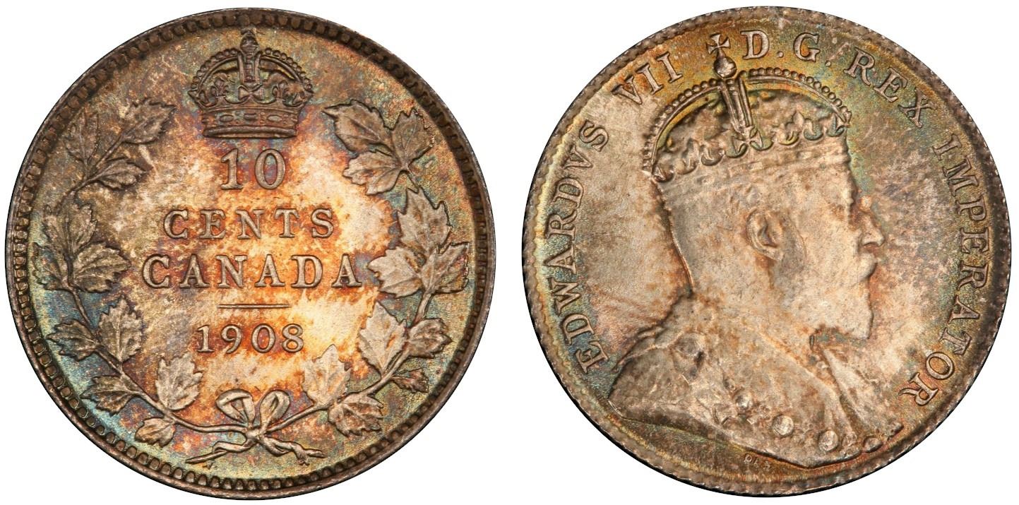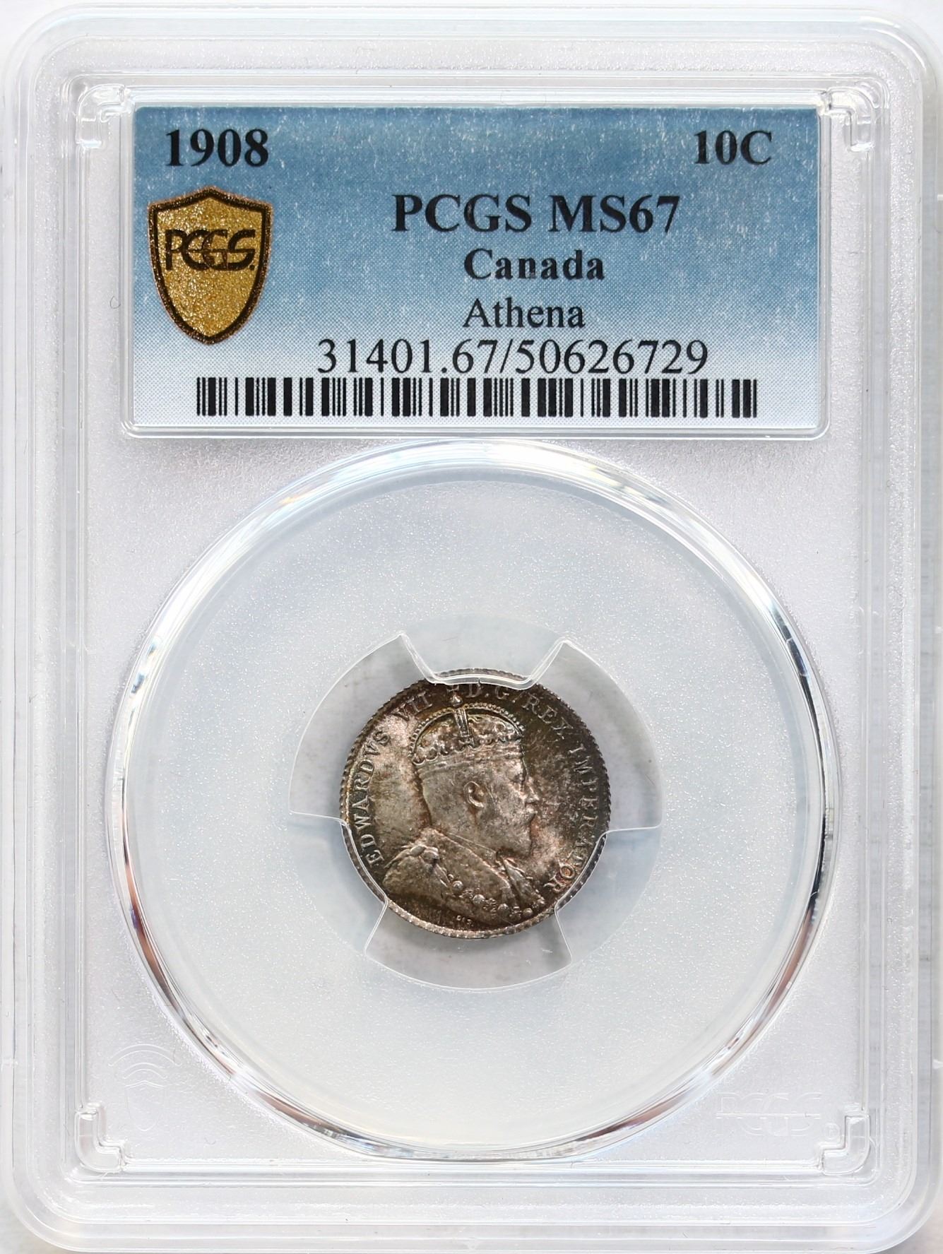 1908 10¢ PCGS Superb Gem Mint State-67. Great lustre with spectacular colours. An amazing example.