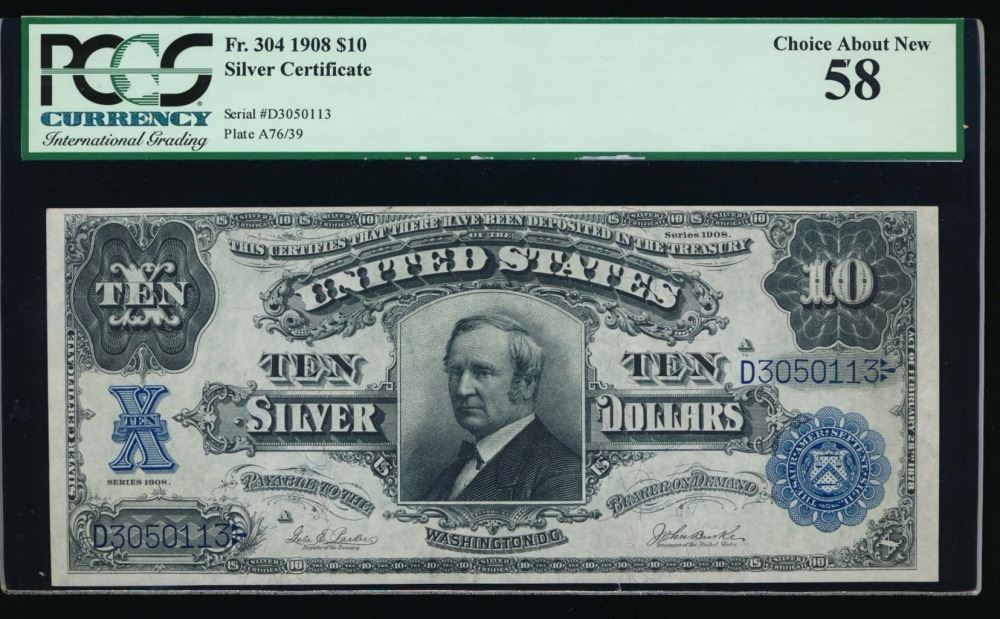 One 1908 $10 Silver Certificate PCGS 58 Choice About New.