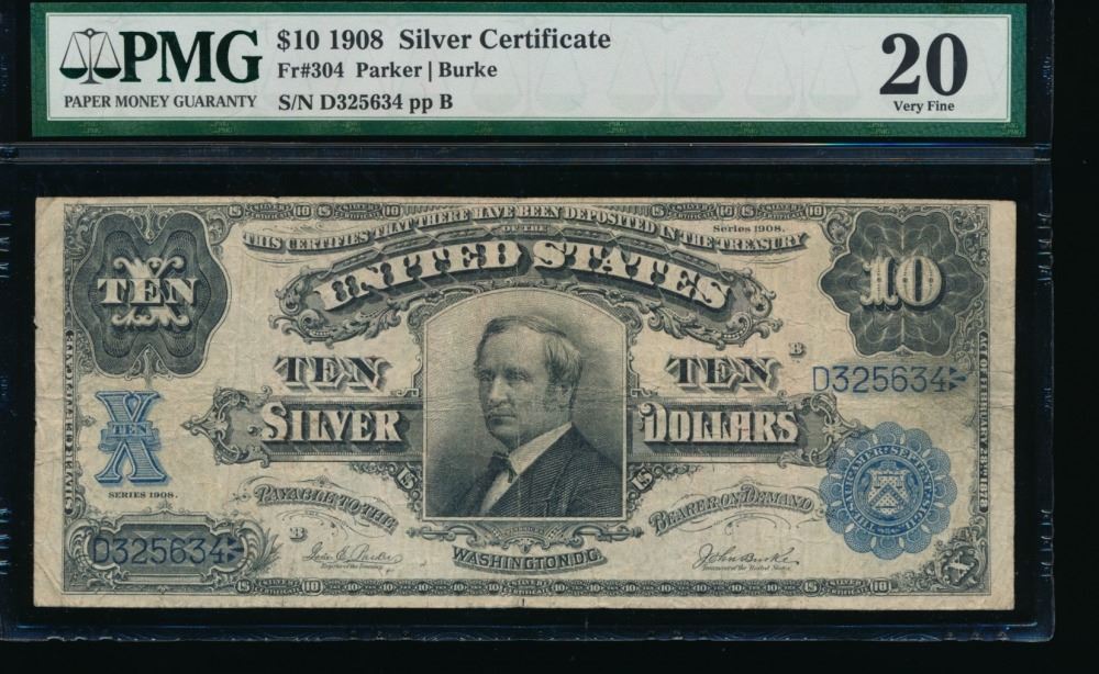 One 1908 $10 Silver Certificate PMG 20.