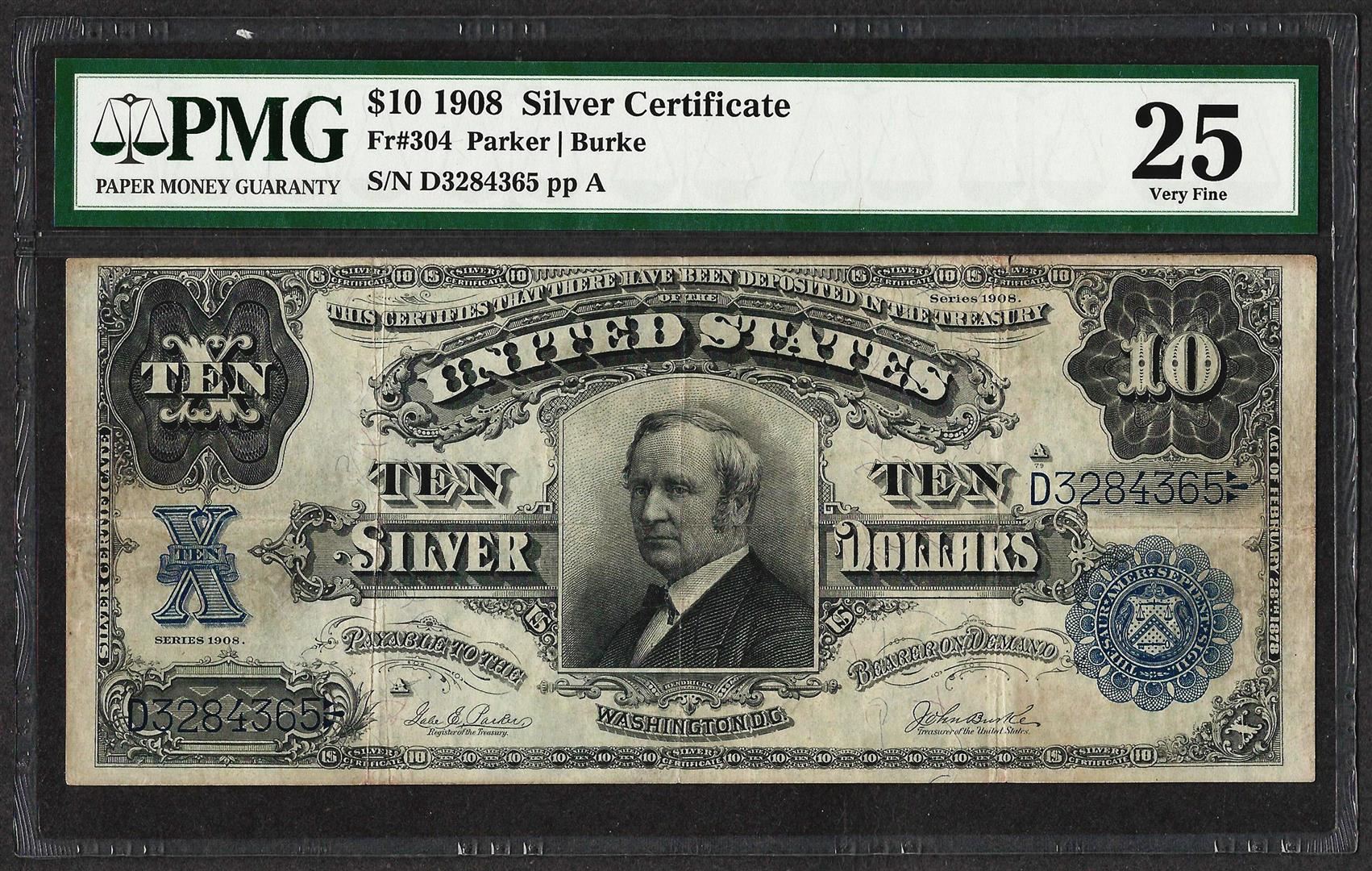One 1908 $10 Tombstone Silver Certificate Note Fr.304 PMG Very Fine 25. PMG Certified.