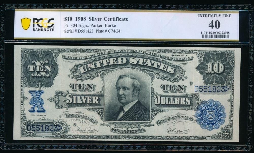 One 1908 $10 Tombstone Silver Certificate PCGS 40.