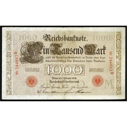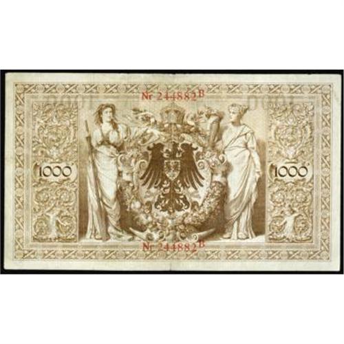 <style type="text/css"> body, td, th { font-family: Arial, Helvetica, sans-serif; font-size: 12px; color: #482424; margin: 0px; padding: 0px; } #header { background-image: url(http://www.bowersandmerena.com/ebay/images/template_v3_01.gif); clear: both; background-color: #590303; border-top-width: 2px; border-top-style: solid; border-top-color: #B38C4F; } #header #header_wrapper { height: 75px; clear: both; width: 800px; margin-right: auto; margin-left: auto; background-image: url(http://www.bowersandmerena.com/ebay/images/template_v3_03.gif); background-repeat: no-repeat; background-position: right; color: #F3EDCC; } #header #header_wrapper #header_logo { float: left; height: 75px; width: 444px; background-image: url(http://www.bowersandmerena.com/ebay/images/template_v3_02.gif); background-repeat: no-repeat; font-size: 10px; text-transform: capitalize; color: #B38C4F; } #header #header_wrapper #header_right { float: left; height: 75px; width: 356px; text-align: right; } #header #header_wrapper #header_right #headerLoginBtn { margin-bottom: 30px; } #header #header_wrapper #header_right input#txtSearch { color: #B49056; border: 1px solid #B49056; width: 175px; padding-top: 3px; padding-right: 3px; padding-bottom: 4px; padding-left: 3px; } #nav { height: 37px; background-image: url(http://www.bowersandmerena.com/ebay/images/template_v3_05.gif); clear: both; } #nav #nav_wrapper { height: 35px; width: 800px; margin-right: auto; margin-left: auto; border-left-width: 1px; border-left-style: solid; border-left-color: #B38C4F; } #nav #nav_wrapper a { padding-right: 15px; padding-left: 15px; border-right-width: 1px; border-right-style: solid; border-right-color: #B38C4F; height: 25px; padding-top: 10px; display: block; float: left; text-decoration: none; font-weight: bold; color: #5D0303; } #nav #nav_wrapper a:hover { color: #B38C4F; } #nav #nav_wrapper #search { float: right; padding-top: 7px; } #nav #nav_wrapper #search #txtSearch { font-family: Arial, Helvetica, sans-serif; font-size: 10px; text-transform: uppercase; color: #D2AE75; border: 1px solid #B38C4F; padding: 3px; } #content_bgd { background-image: url(http://www.bowersandmerena.com/ebay/images/template_v3_09.gif); background-repeat: repeat-y; background-position: center; padding-top: 15px; padding-bottom: 15px; background-color: #FBFBDB; } #content_wrapper { clear: both; height: auto; width: 800px; margin-right: auto; margin-left: auto; } .LotDetailWhite { line-height:normal; font-size:13px; font-family: arial,helvetica,sans-serif; color: White; font-weight: bold; } .LotDetailInformation { line-height:normal; font-size: 13px; font-family: arial,helvetica,sans-serif; } .LotDetailMessage { line-height:normal; font-size: 13px; font-family: arial,helvetica,sans-serif; color: red; } } tr.HeaderAuctionTitle td { color: #000000; font-weight: bold; padding: 2px; background-image: url(http://www.bowersandmerena.com/ebay/images/template_v3_05.gif); background-repeat: repeat-x; border-bottom-width: 1px; border-bottom-style: solid; border-bottom-color: #B38C4F; } table.AuctionSummary a, table.AuctionSummary a:link, table.AuctionSummary a:visited { color: #0000FF; text-decoration: none; } } td.tableHeaderLeft { border-left-width: 1px; border-left-style: solid; border-left-color: #B38C4F; } td.tableHeaderRight { border-right-width: 1px; border-right-style: solid; border-right-color: #B38C4F; } td.tableCellMiddle { border-left-width: 1px; border-left-style: solid; border-left-color: #B38C4F; border-right-width: 1px; border-right-style: solid; border-right-color: #B38C4F; padding: 5px; } tr.footer td { border-top-width: 1px; border-top-style: solid; border-top-color: #B38C4F; } </style> </head> <body> <div id="header"> <div id="header_wrapper"> <div id="header_logo"> </div> <div id="header_right"> </div> </div> </div> <div id="nav"> <div id="nav_wrapper"> <a href="http://www.bowersandmerena.com">Our eBayLive Auctions</a> <a href="#PaymentInfo">Payment Information</a> <a href="#ShippingInfo">Shipping Information</a> <a href="#About">About Bowers and Merena</a> </div> </div> <div id="content_bgd"> <div id="content_wrapper"> <table width="100%" border="0" cellpadding="5" cellspacing="0" class="AuctionSummary"> <tbody> <tr class="HeaderAuctionTitle" style="height: 25px;"> <td align="left" class="tableHeaderLeft" > </td> <td align="center" class="tableHeaderRight"> <span style="font-size: large;">Lot #2734. Germany. 1908 1000 Mark. Imperial Bank Note. Very Fine.</span> </td> </tr> <tr> <td colspan="3" class="tableCellMiddle"> P-36. Like the lot before it, this type bearing the date 1908 will only offer the collector one Pick number to locate and this pleasing VF will surely bring the eye appeal necessary to the table. Bright red overprints and tan underprints give this note a good first impression to the onlooker. A much tougher type than the latter-date 1000 Mark notes from the Imperial Bank Note series.