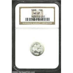1908 10C MS67 NGC. A glittering Superb Gem Barber Dime. Brilliant throughout, the fields are bright.