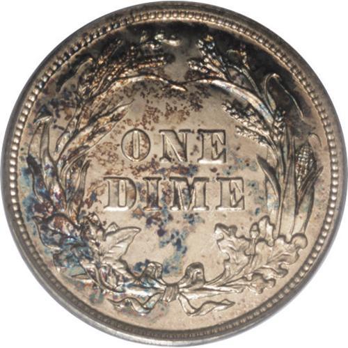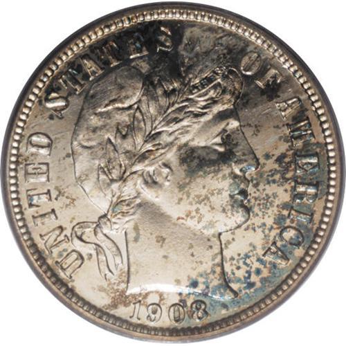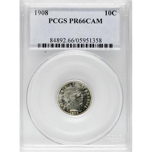 <B>1908 10C PR66 Cameo PCGS.</B></I> Beyond its interest visually as a high grade type coin, this piece has several points of interest from a numismatic standpoint. The fields retain many of the die striations that created the deep reflectivity on each side. A couple of spindly die cracks are seen near the upper rim above TATE, which is quite unusual on a proof striking. A few long, shallow laminations are also barely perceptible with magnification. The devices are nicely frosted and provide noticeable contrast against the fields. Speckled light russet and blue toning is seen over the still mostly brilliant surfaces. Population: 4 in 66 Cameo, 2 finer (4/07).<BR><BR><b>Shipping:</b> Coins & Currency (<a target="_blank" href="http://www.heritageauctions.com/common/shipping.php">view shipping information</a>)