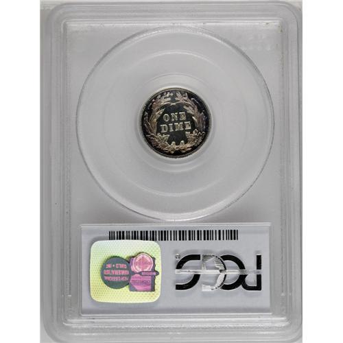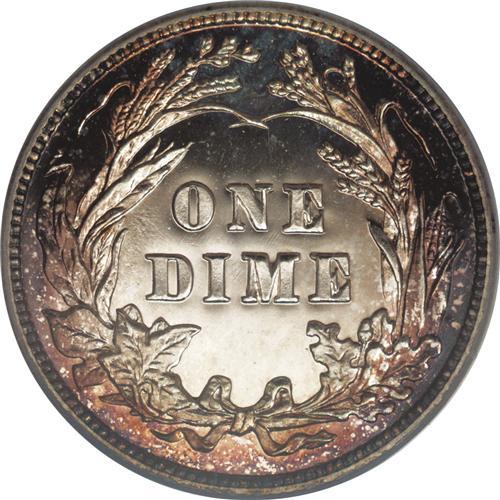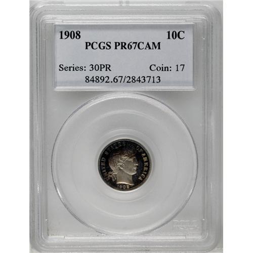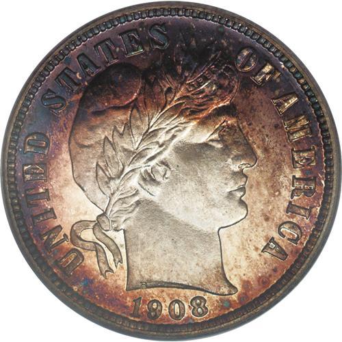<B>1908<10C> PR67 Cameo PCGS.</B></I> This is an amazing Superb Cameo proof example with deep lilac and blue toning around bright central areas on both sides. All of the design elements are sharply defined as expected, and the contrast is truly outstanding. Few Cameo quality proof coins were produced during this era, and survivors are now especially elusive and desirable. Population: 2 in 67, 0 finer (4/06).